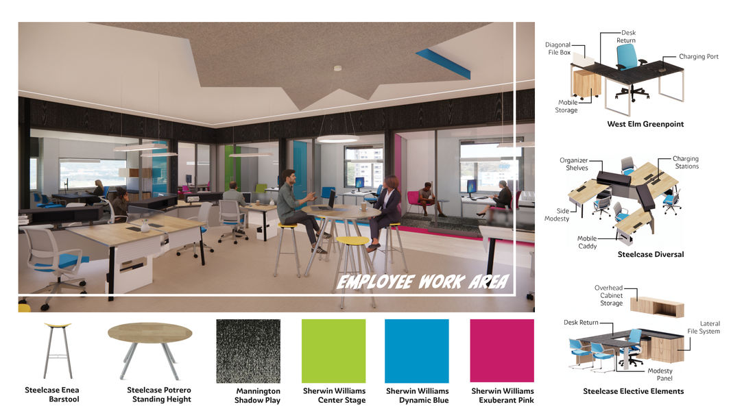 The bold, playful space encourages occupants to collaborate and celebrate the graphic qualities of different the majors and professions. The design serves as a backdrop for the creative work produced amongst students and employees.
